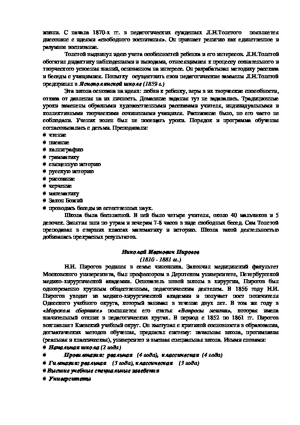 и беседы с учащимися. Попытку осуществить свои педагогические замыслы Л.Н.Толстой