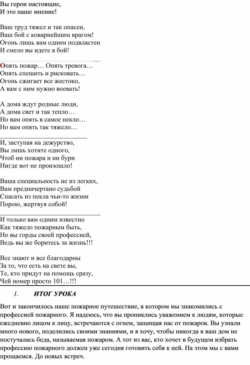 Вот и закончилось наше пожарное путешествие, в котором мы знакомились с профессией пожарного. Я надеюсь, что вы прониклись уважением к людям, которые ежедневно лицом к лицу, встречаются с огнем, защищая нас от пожаров. Вы узнали много нового, поделились своими знаниями, и я хочу, чтобы никогда в ваш дом не постучалась беда, называемая пожаром. А тот из вас, кто хочет в будущем избрать профессию пожарного должен уже сегодня готовить себя к ней. На этом мы с вами прощаемся. До новых встреч.