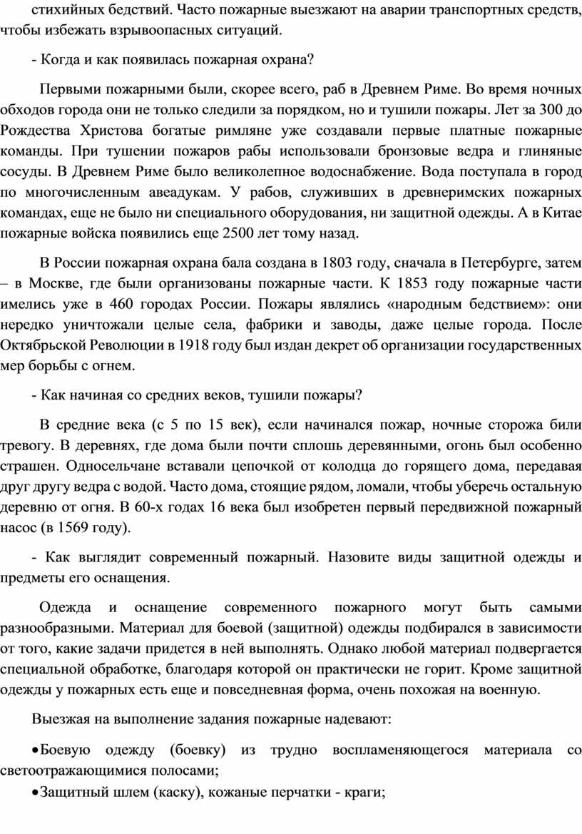 Много лет тому назад первобытные люди узнали, что такое огонь. Позднее людям пришлось придумать способы борьбы с пожарами, потому что огонь иногда становиться настоящим бедствием. У пожарной охраны дел хоть отбавляй. Пожарные не только тушат пожары, но и помогают людям во время наводнений и других стихийных бедствий. Часто пожарные выезжают на аварии транспортных средств, чтобы избежать взрывоопасных ситуаций.