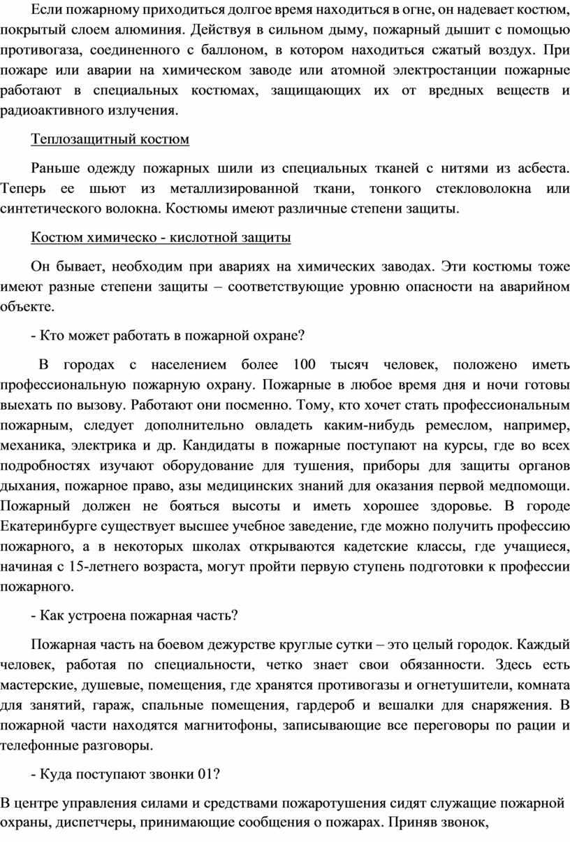 Если пожарному приходиться долгое время находиться в огне, он надевает костюм, покрытый слоем алюминия. Действуя в сильном дыму, пожарный дышит с помощью противогаза, соединенного с баллоном, в котором находиться сжатый воздух. При пожаре или аварии на химическом заводе или атомной электростанции пожарные работают в специальных костюмах, защищающих их от вредных веществ и радиоактивного излучения.