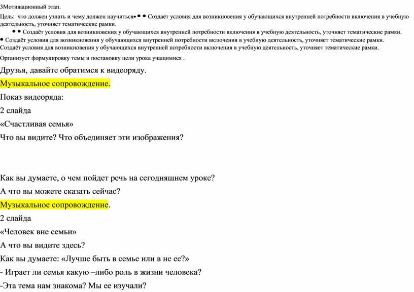 Создаёт условия для возникновения у обучающихся внутренней потребности включения в учебную деятельность, уточняет тематические рамки. Организует формулировку темы и постановку цели урока учащимися . Друзья, давайте обратимся к видеоряду. Музыкальное сопровождение. Показ видеоряда: 2 слайда «Счастливая семья» Что вы видите? Что объединяет эти изображения?