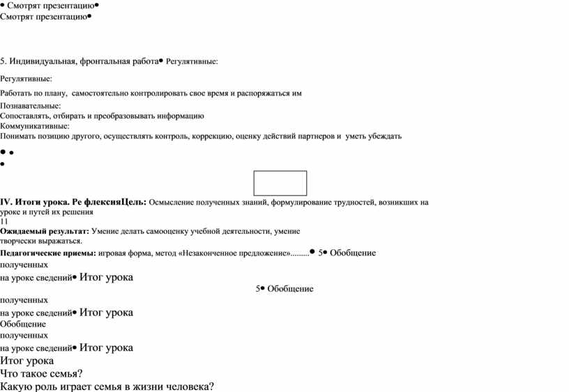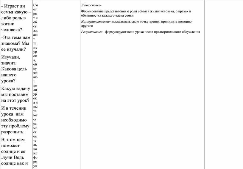 Личностные- Формирование представления о роли семьи в жизни человека, о правах и обязанностях каждого члена семьи Коммуникативные- высказывать свою точку зрения, принимать позицию другого Регулятивные- формулируют цели урока после предварительного обсуждения