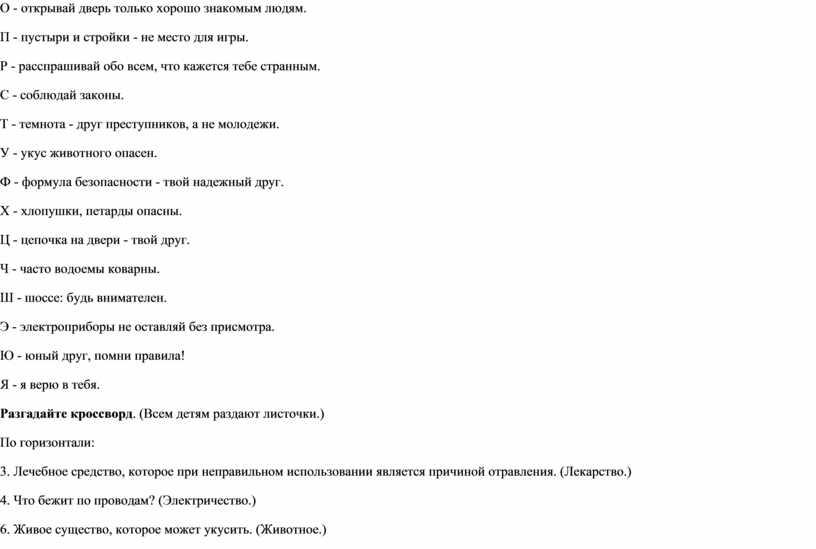 Подведение итогов Учитель. Закончим урок чтением азбуки безопасности. (У каждого ученика на столе лежат листочки с текстом азбуки. Дети по цепочке читают.) Азбука безопасности А - автомобиль - это опасно. Б - будь начеку. В - всегда помни свой адрес и номер телефона. Г - громко кричи, если нужна помощь. Д - делись всеми страхами и подозрениями с родителями. Ж - жалуйся родителям, если кто-то делает тебе больно. 3 - звони домой, если собираешься задержаться. И - играй только в безопасных местах. К - красть нехорошо! Л - лазают по деревьям и заборам только дураки. М - мама должна знать все! Н - никуда не иди с незнакомыми людьми. О - открывай дверь только хорошо знакомым людям. П - пустыри и стройки - не место для игры. Р - расспрашивай обо всем, что кажется тебе странным. С - соблюдай законы. Т - темнота - друг преступников, а не молодежи. У - укус животного опасен. Ф - формула безопасности - твой надежный друг. X - хлопушки, петарды опасны. Ц - цепочка на двери - твой друг. Ч - часто водоемы коварны. Ш - шоссе: будь внимателен. Э - электроприборы не оставляй без присмотра. Ю - юный друг, помни правила! Я - я верю в тебя. Разгадайте кроссворд. (Всем детям раздают листочки.) По горизонтали: 3. Лечебное средство, которое при неправильном использовании является причиной отравления. (Лекарство.) 4. Что бежит по проводам? (Электричество.) 6. Живое существо, которое может укусить. (Животное.) По вертикали: 1. То, что на проезжей части таит в себе опасность для пешехода. (Транспорт.) 2. Причина потопа. (Вода.) 5. Причина пожара. (Огонь.) -Опасности подстерегают нас всюду, опасными могут оказаться даже предметы, которыми мы пользуемся каждый день. Давайте поиграем. Я буду называть предмет, а вы говорите, чем он полезен и когда может быть опасным для человека. Авторучка.