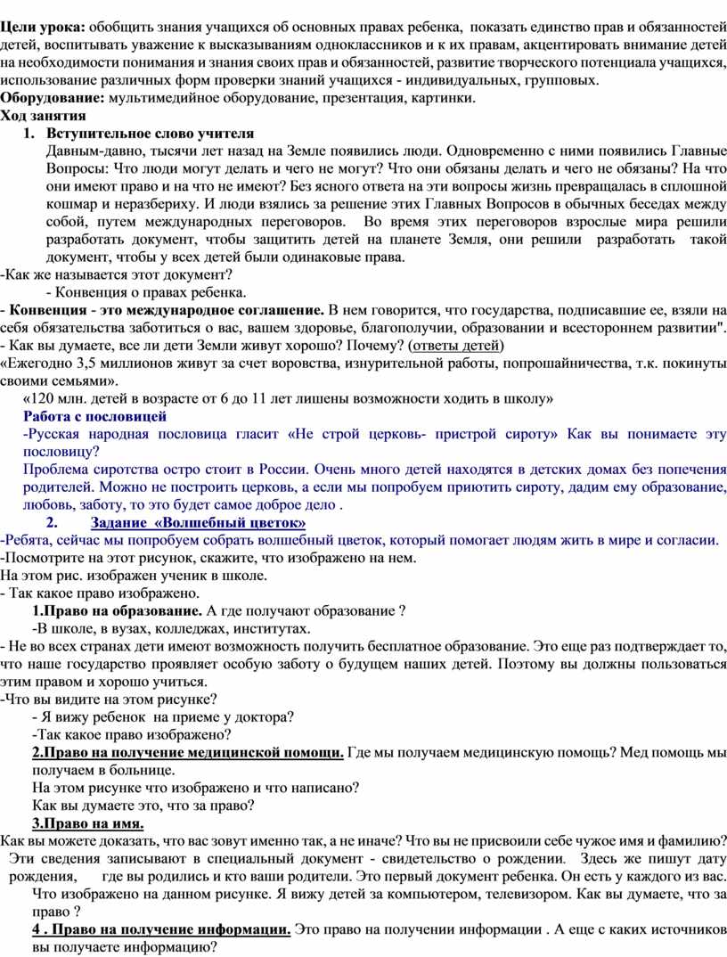 Цели урока: обобщить знания учащихся об основных правах ребенка, показать единство прав и обязанностей детей, воспитывать уважение к высказываниям одноклассников и к их правам, акцентировать внимание детей на необходимости понимания и знания своих прав и обязанностей, развитие творческого потенциала учащихся, использование различных форм проверки знаний учащихся - индивидуальных, групповых.