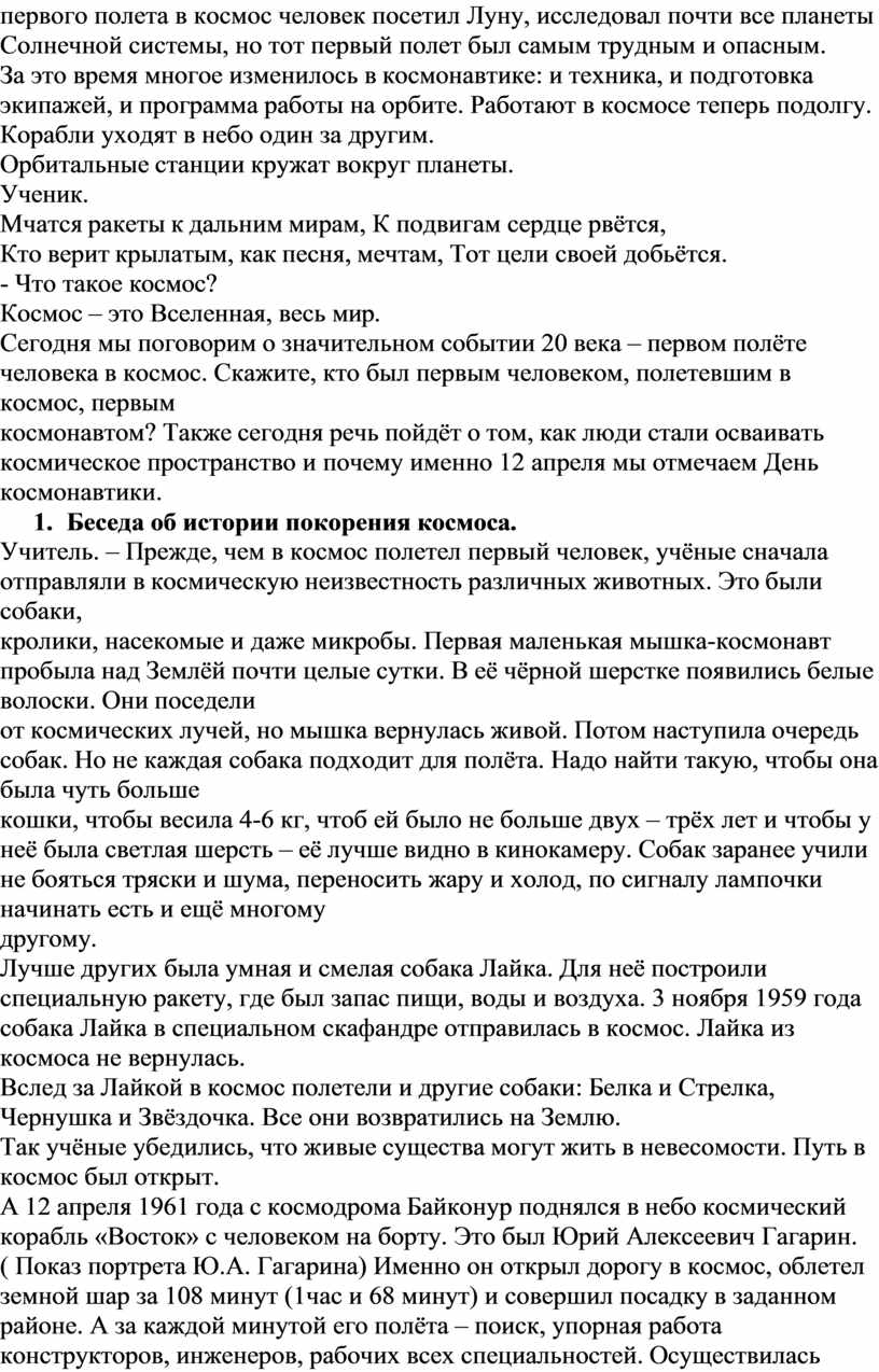 Учитель. – Прежде, чем в космос полетел первый человек, учёные сначала отправляли в космическую неизвестность различных животных. Это были собаки,