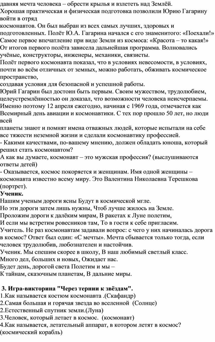 Учитель. Издавна человечество стремилось к звёздам. С незапамятных времён люди мечтали о полётах на Луну, на планеты солнечной системы, к далёким таинственным мирам. Свершилось великое событие, впервые в истории человек осуществил полёт в космос. Нам выпала честь первым проникнуть в космос. История навсегда сохранит день 12 апреля 1961 года.