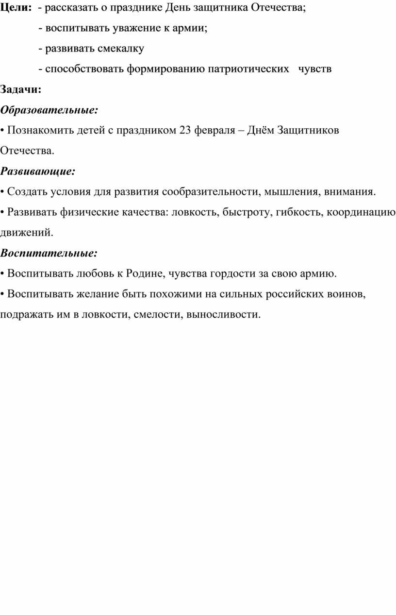 Познакомить детей с праздником 23 февраля – Днём Защитников Отечества.