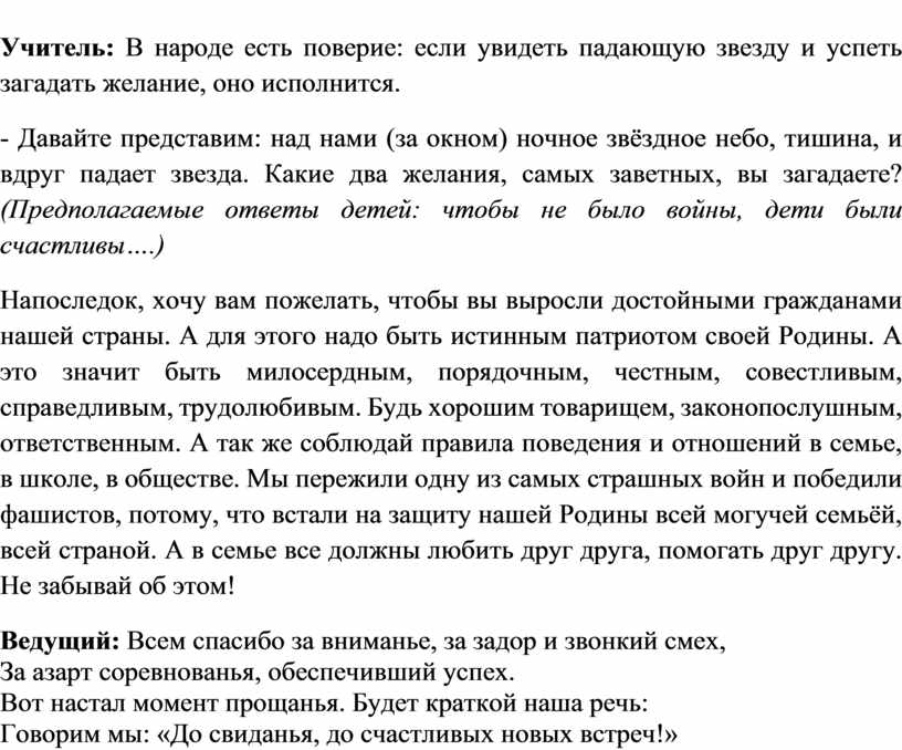 Напоследок, хочу вам пожелать, чтобы вы выросли достойными гражданами нашей страны. А для этого надо быть истинным патриотом своей Родины. А это значит быть милосердным, порядочным, честным, совестливым, справедливым, трудолюбивым. Будь хорошим товарищем, законопослушным, ответственным. А так же соблюдай правила поведения и отношений в семье, в школе, в обществе. Мы пережили одну из самых страшных войн и победили фашистов, потому, что встали на защиту нашей Родины всей могучей семьёй, всей страной. А в семье все должны любить друг друга, помогать друг другу. Не забывай об этом!
