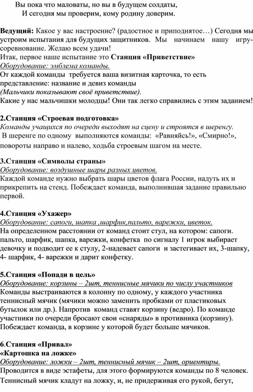 Ведущий: Какое у вас настроение? (радостное и приподнятое…) Сегодня мы устроим испытания для будущих защитников. Мы начинаем нашу игру-соревнование. Желаю всем удачи!