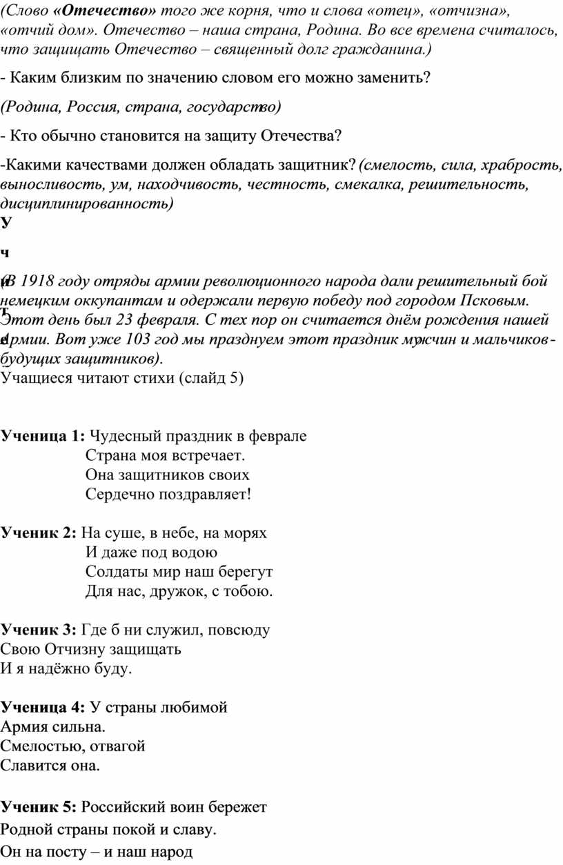 (В 1918 году отряды армии революционного народа дали решительный бой немецким оккупантам и одержали первую победу под городом Псковым. Этот день был 23 февраля. С тех пор он считается днём рождения нашей Армии. Вот уже 103 год мы празднуем этот праздник мужчин и мальчиков - будущих защитников).