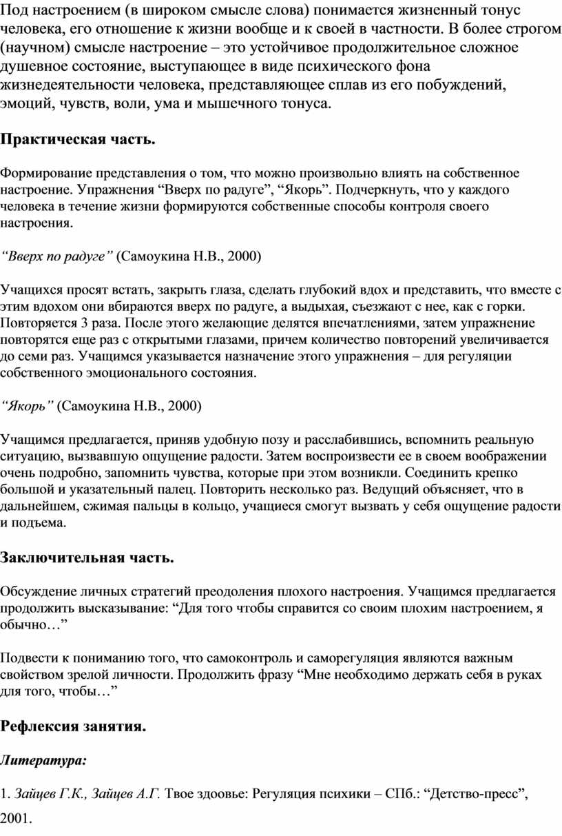 1. Зайцев Г.К., Зайцев А.Г. Твое здоовье: Регуляция психики – СПб.: “Детство-пресс”, 2001.
