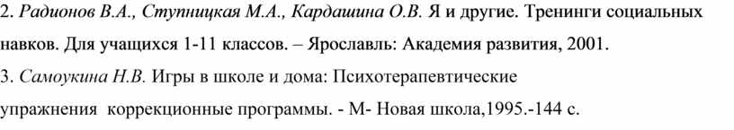 2. Радионов В.А., Ступницкая М.А., Кардашина О.В. Я и другие. Тренинги социальных навков. Для учащихся 1-11 классов. – Ярославль: Академия развития, 2001.