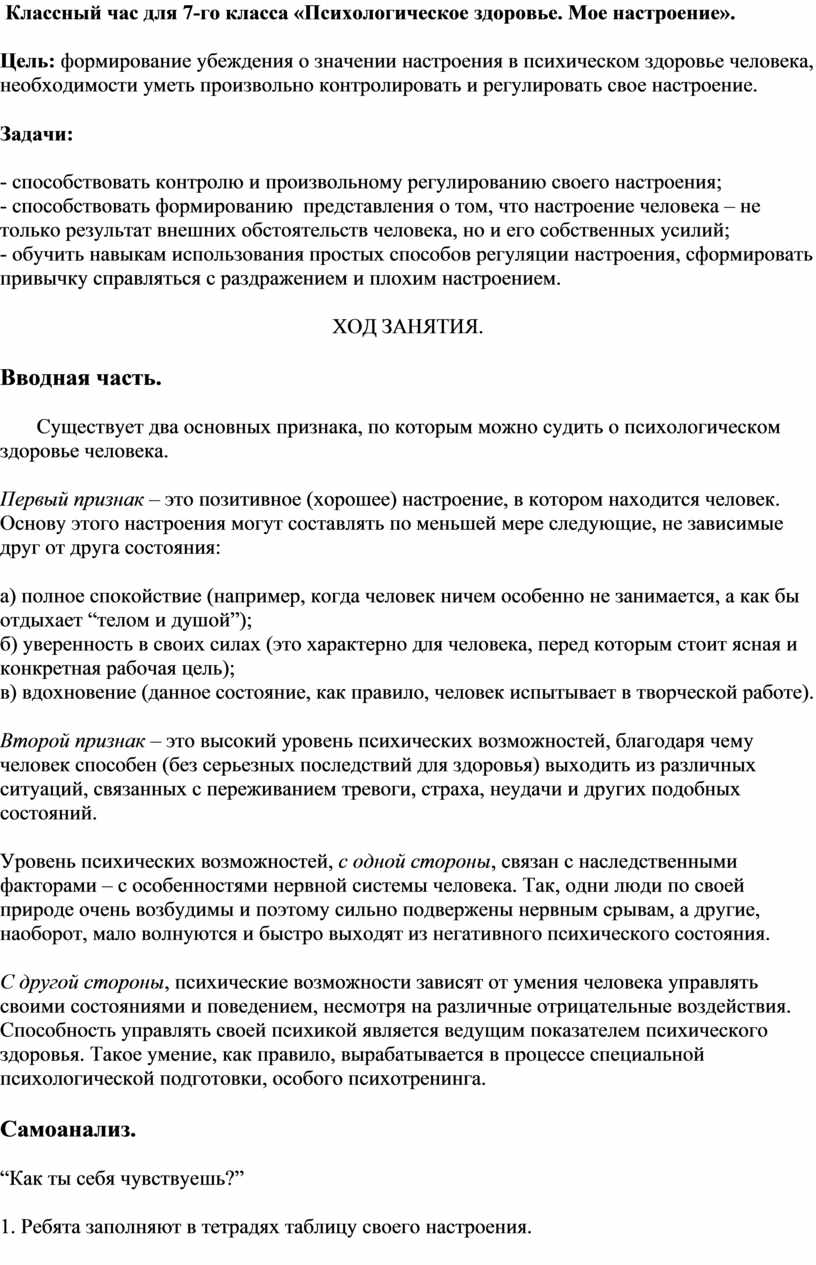 Цель: формирование убеждения о значении настроения в психическом здоровье человека, необходимости уметь произвольно контролировать и регулировать свое настроение.