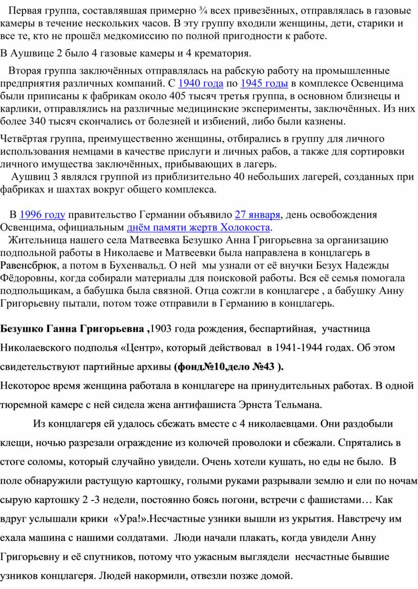 Жительница нашего села Матвеевка Безушко Анна Григорьевна за организацию подпольной работы в Николаеве и Матвеевки была направлена в концлагерь в Равенсбрюк, а потом в Бухенвальд. О ней мы узнали от её внучки Безух Надежды Фёдоровны, когда собирали материалы для поисковой работы. Вся её семья помогала подпольщикам, а бабушка была связной. Отца сожгли в концлагере , а бабушку Анну Григорьевну пытали, потом тоже отправили в Германию в концлагерь.