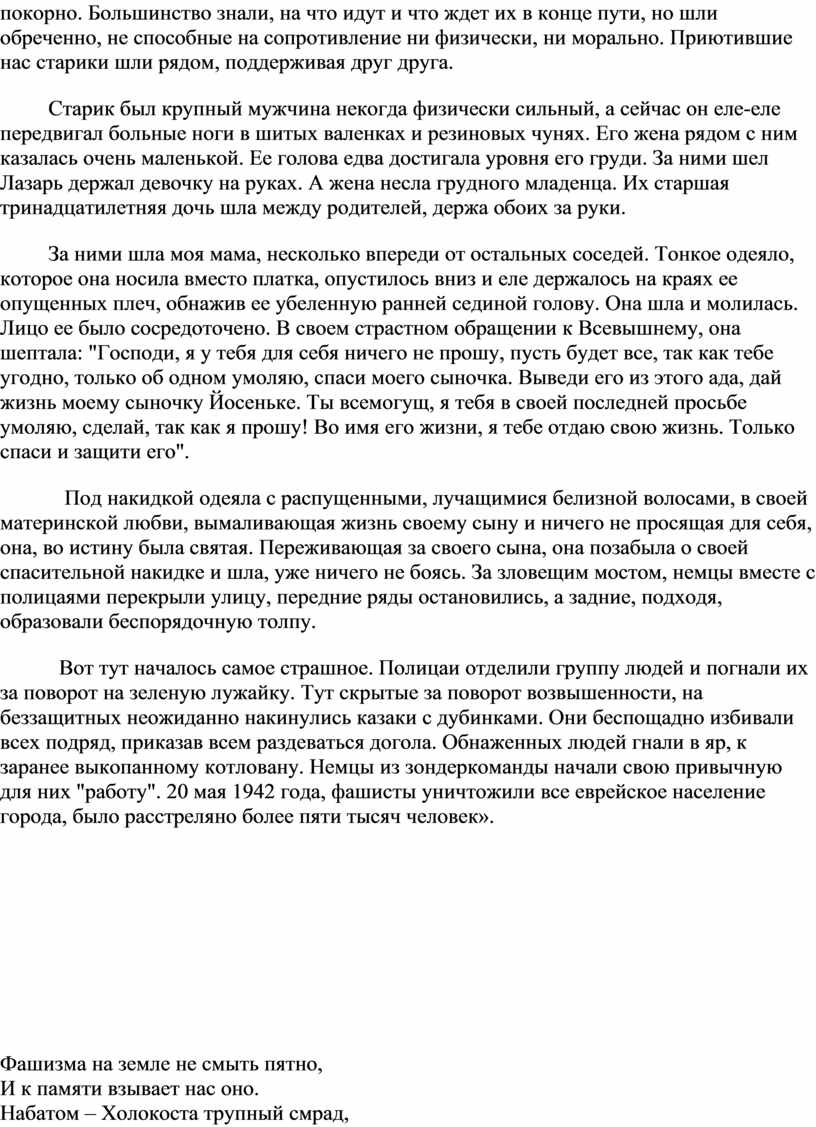 Женщины с детьми шли, еле передвигая ноги, без защиты и опоры, сопровождаемые плачем голодных детей и мольбами стариков. Шли по проезжей части улицы, а по обеим сторонам тротуаров траурную процессию идущих на смерть наблюдали местные жители. Некоторые верили или убедили себя в переселение и шли покорно. Большинство знали, на что идут и что ждет их в конце пути, но шли обреченно, не способные на сопротивление ни физически, ни морально. Приютившие нас старики шли рядом, поддерживая друг друга.