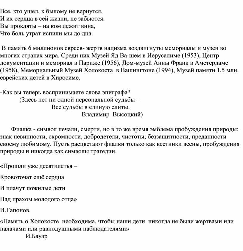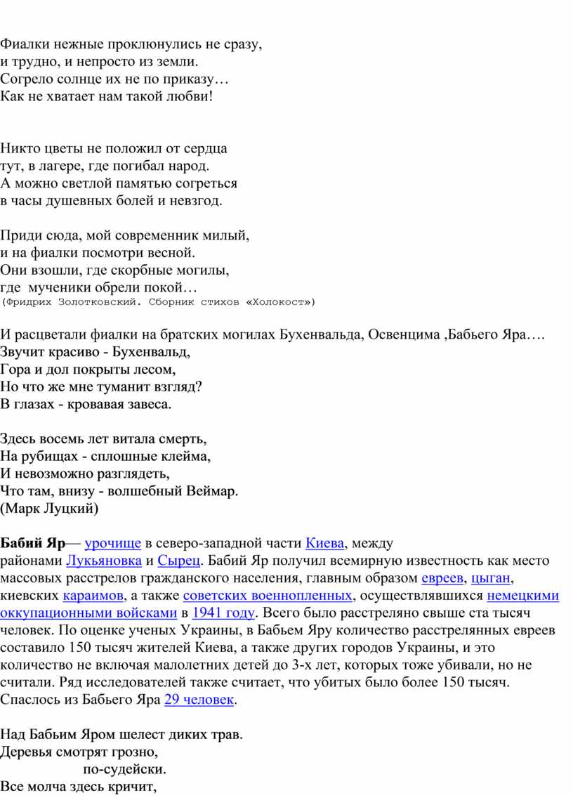 И расцветали фиалки на братских могилах Бухенвальда, Освенцима ,Бабьего Яра….