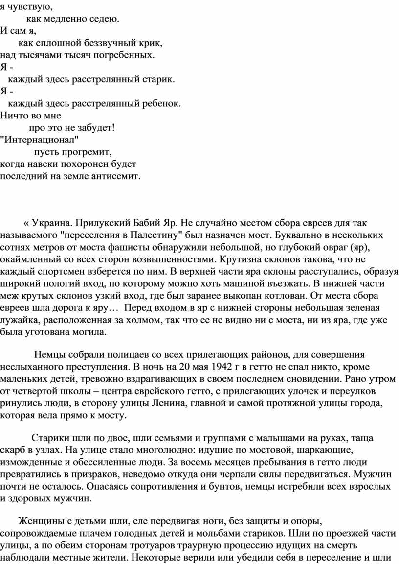 « Украина. Прилукский Бабий Яр. Не случайно местом сбора евреев для так называемого "переселения в Палестину" был назначен мост. Буквально в нескольких сотнях метров от моста фашисты обнаружили небольшой, но глубокий овраг (яр), окаймленный со всех сторон возвышенностями. Крутизна склонов такова, что не каждый спортсмен взберется по ним. В верхней части яра склоны расступались, образуя широкий пологий вход, по которому можно хоть машиной въезжать. В нижней части меж крутых склонов узкий вход, где был заранее выкопан котлован. От места сбора евреев шла дорога к яру… Перед входом в яр с нижней стороны небольшая зеленая лужайка, расположенная за холмом, так что ее не видно ни с моста, ни из яра, где уже была уготована могила.