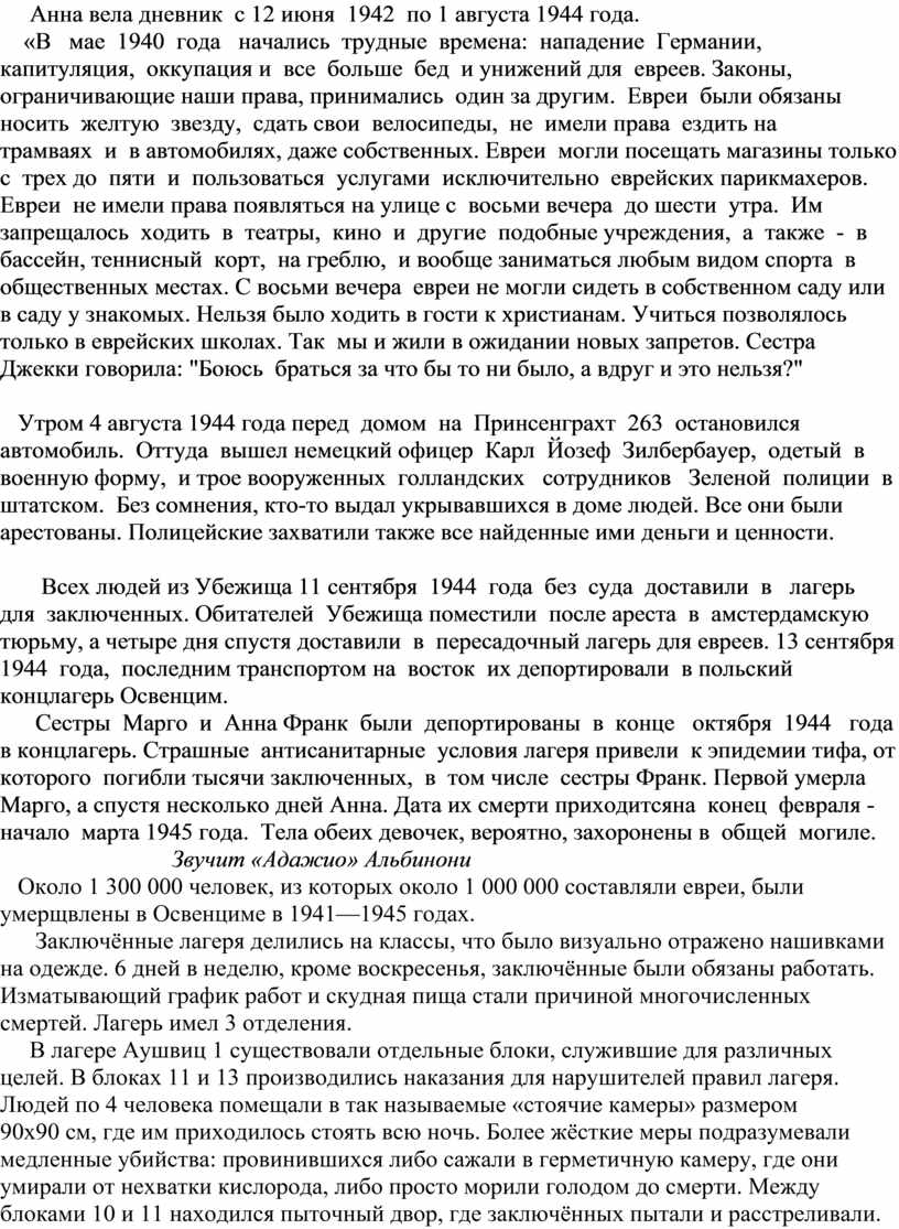 Всех людей из Убежища 11 сентября 1944 года без суда доставили в лагерь для заключенных. Обитателей Убежища поместили после ареста в амстердамскую тюрьму, а четыре дня спустя доставили в пересадочный лагерь для евреев. 13 сентября 1944 года, последним транспортом на восток их депортировали в польский концлагерь Освенцим. Сестры Марго и Анна Франк были депортированы в конце октября 1944 года в концлагерь. Страшные антисанитарные условия лагеря привели к эпидемии тифа, от которого погибли тысячи заключенных, в том числе сестры Франк. Первой умерла Марго, а спустя несколько дней Анна. Дата их смерти приходитсяна конец февраля - начало марта 1945 года. Тела обеих девочек, вероятно, захоронены в общей могиле. Звучит «Адажио» АльбинониОколо 1 300 000 человек, из которых около 1 000 000 составляли евреи, были умерщвлены в Освенциме в 1941—1945 годах.