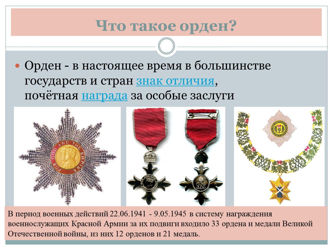 Орден - в настоящее время в большинстве государств и стран знак отличия, почётная награда за особые заслуги