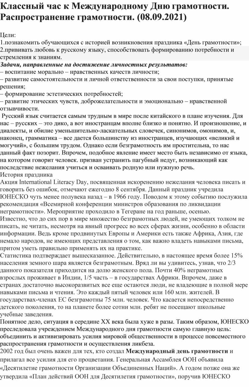 Классный час к Международному Дню грамотности. Распространение грамотности. (08.09.2021)