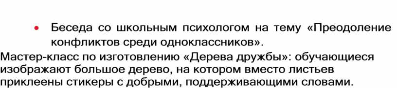 · Беседа со школьным психологом на тему «Преодоление конфликтов среди одноклассников».