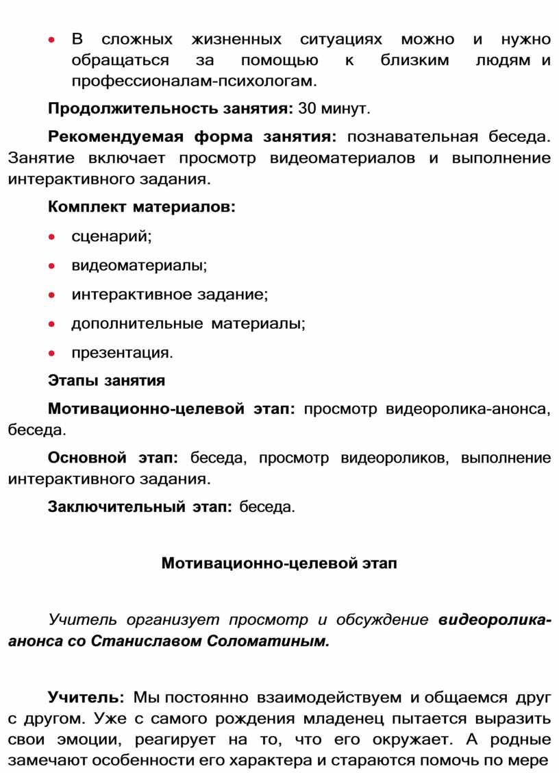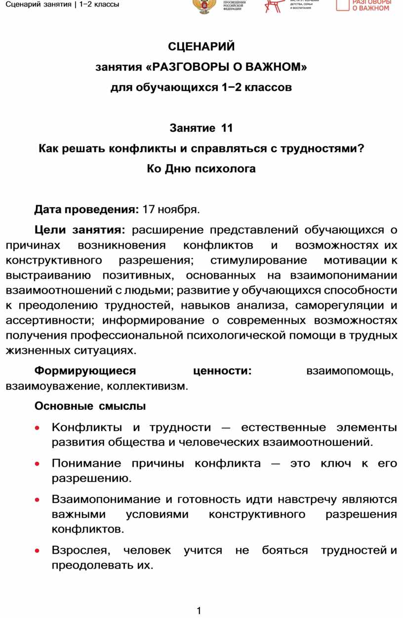 Цели занятия: расширение представлений обучающихся о причинах возникновения конфликтов и возможностях их конструктивного разрешения; стимулирование мотивации к выстраиванию позитивных, основанных на взаимопонимании взаимоотношений с людьми; развитие у обучающихся способности к преодолению трудностей, навыков анализа, саморегуляции и ассертивности; информирование о современных возможностях получения профессиональной психологической помощи в трудных жизненных ситуациях.