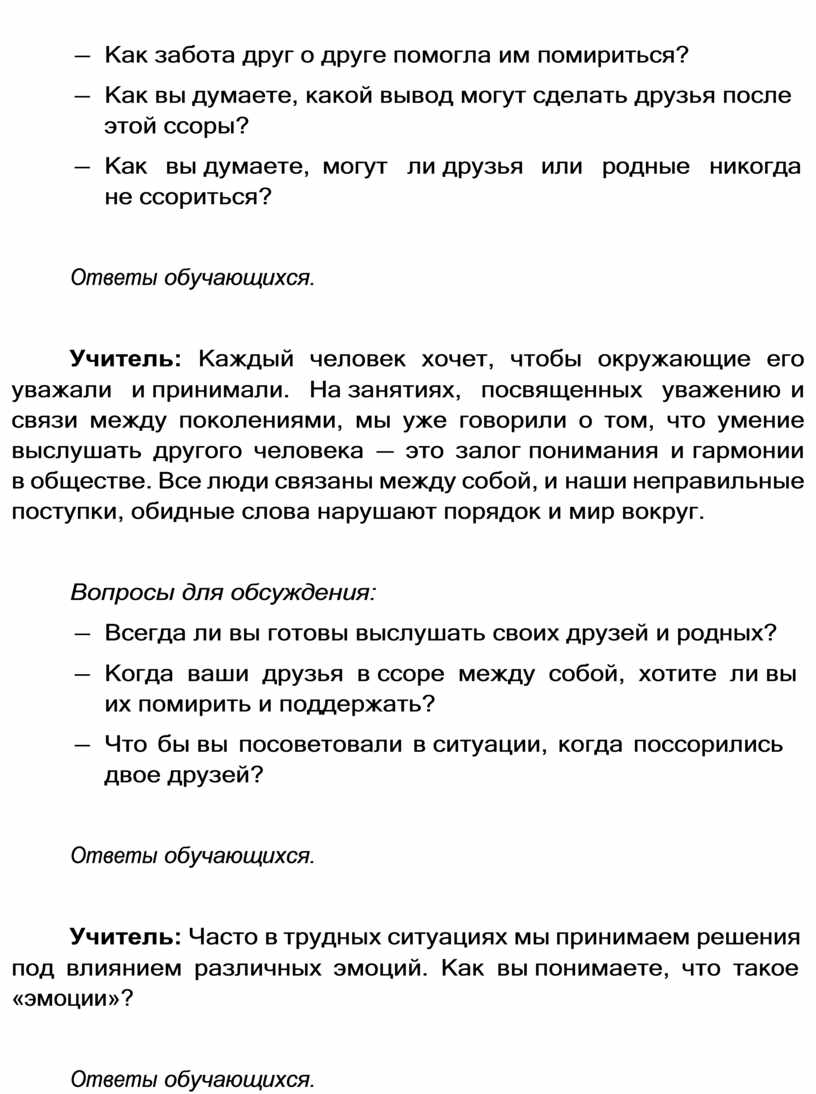 Учитель: Каждый человек хочет, чтобы окружающие его уважали и принимали. На занятиях, посвященных уважению и связи между поколениями, мы уже говорили о том, что умение выслушать другого человека — это залог понимания и гармонии в обществе. Все люди связаны между собой, и наши неправильные поступки, обидные слова нарушают порядок и мир вокруг.