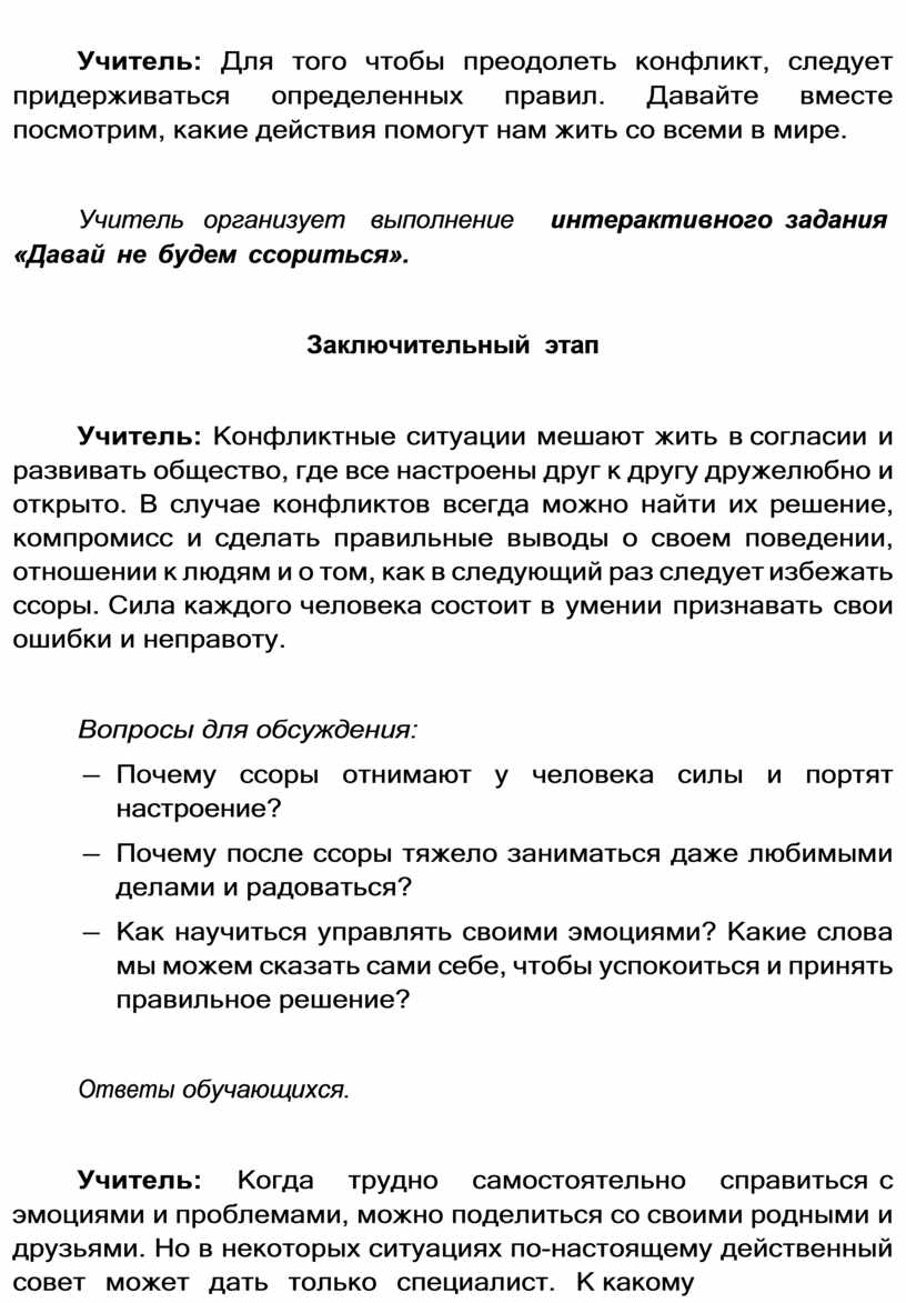 Учитель: Конфликтные ситуации мешают жить в согласии и развивать общество, где все настроены друг к другу дружелюбно и открыто. В случае конфликтов всегда можно найти их решение, компромисс и сделать правильные выводы о своем поведении, отношении к людям и о том, как в следующий раз следует избежать ссоры. Сила каждого человека состоит в умении признавать свои ошибки и неправоту.
