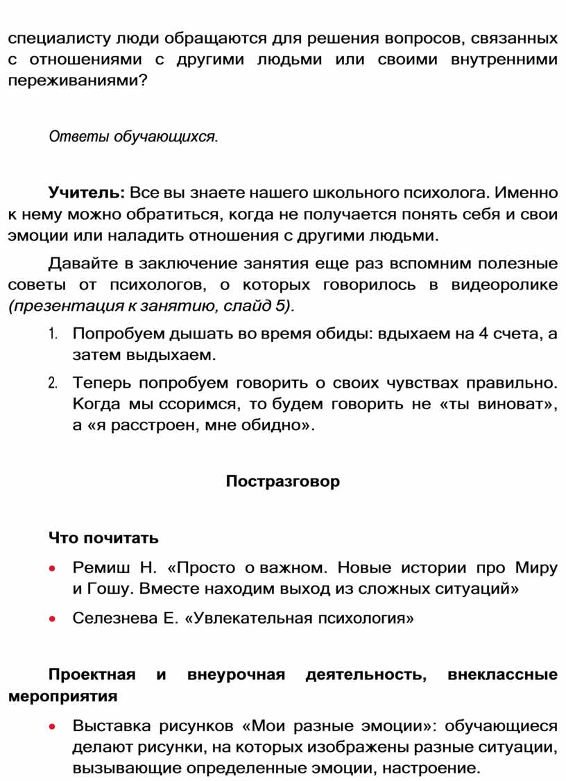Учитель: Когда трудно самостоятельно справиться с эмоциями и проблемами, можно поделиться со своими родными и друзьями. Но в некоторых ситуациях по-настоящему действенный совет может дать только специалист. К какому