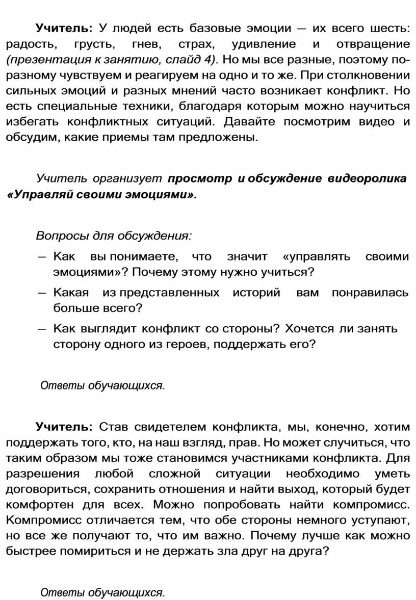 Учитель: У людей есть базовые эмоции — их всего шесть: радость, грусть, гнев, страх, удивление и отвращение (презентация к занятию, слайд 4). Но мы все разные, поэтому по- разному чувствуем и реагируем на одно и то же. При столкновении сильных эмоций и разных мнений часто возникает конфликт. Но есть специальные техники, благодаря которым можно научиться избегать конфликтных ситуаций. Давайте посмотрим видео и обсудим, какие приемы там предложены.