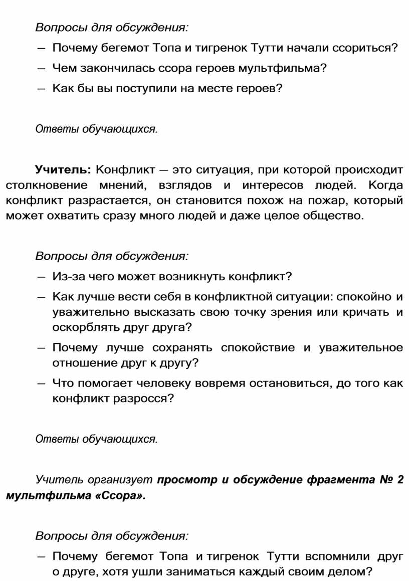 Учитель организует просмотр и обсуждение фрагмента № 2 мультфильма «Ссора».