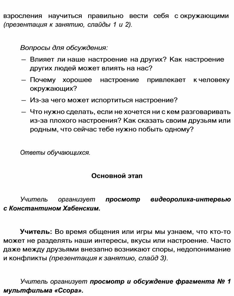 Учитель: Во время общения или игры мы узнаем, что кто-то может не разделять наши интересы, вкусы или настроение. Часто даже между друзьями внезапно возникают споры, недопонимание и конфликты (презентация к занятию, слайд 3).