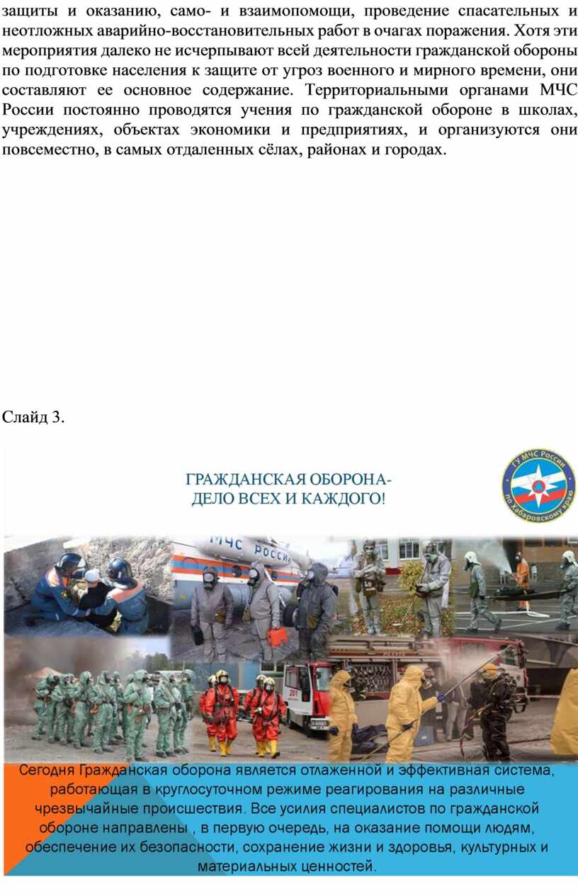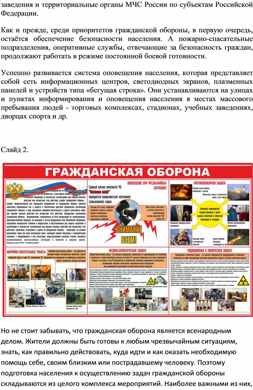 Но не стоит забывать, что гражданская оборона является всенародным делом. Жители должны быть готовы к любым чрезвычайным ситуациям, знать, как правильно действовать, куда идти и как оказать необходимую помощь себе, своим близким или пострадавшему человеку. Поэтому подготовка населения к осуществлению задач гражданской обороны складываются из целого комплекса мероприятий. Наиболее важными из них, направленными непосредственно на защиту населения, являются обучение населения мерам защиты и оказанию, само- и взаимопомощи, проведение спасательных и неотложных аварийно-восстановительных работ в очагах поражения. Хотя эти мероприятия далеко не исчерпывают всей деятельности гражданской обороны по подготовке населения к защите от угроз военного и мирного времени, они составляют ее основное содержание. Территориальными органами МЧС России постоянно проводятся учения по гражданской обороне в школах, учреждениях, объектах экономики и предприятиях, и организуются они повсеместно, в самых отдаленных сёлах, районах и городах.