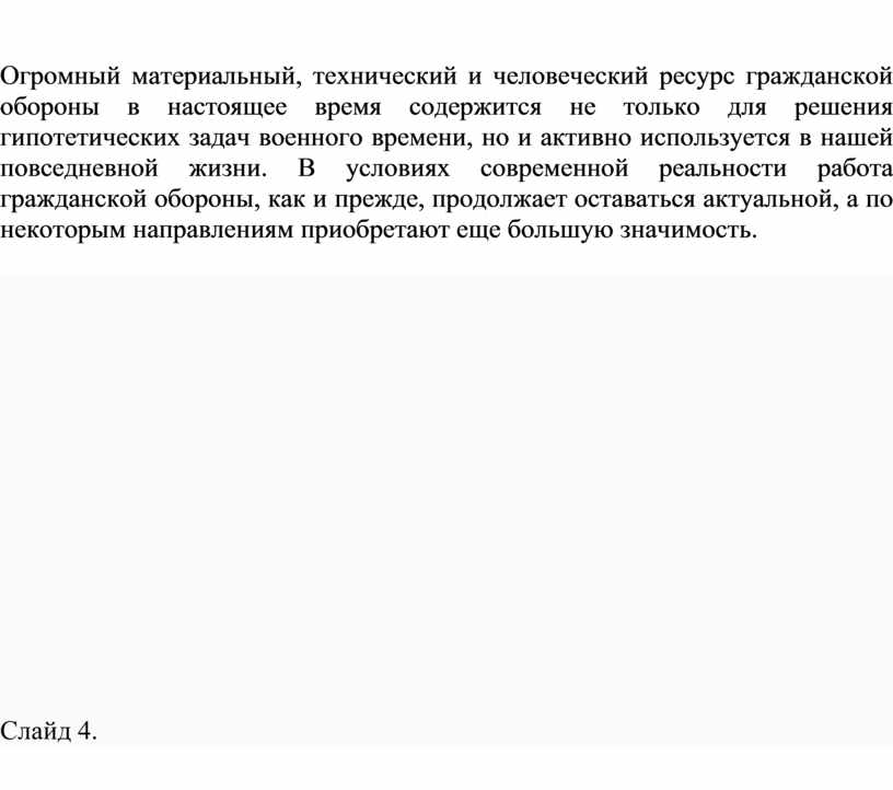 Огромный материальный, технический и человеческий ресурс гражданской обороны в настоящее время содержится не только для решения гипотетических задач военного времени, но и активно используется в нашей повседневной жизни. В условиях современной реальности работа гражданской обороны, как и прежде, продолжает оставаться актуальной, а по некоторым направлениям приобретают еще большую значимость.