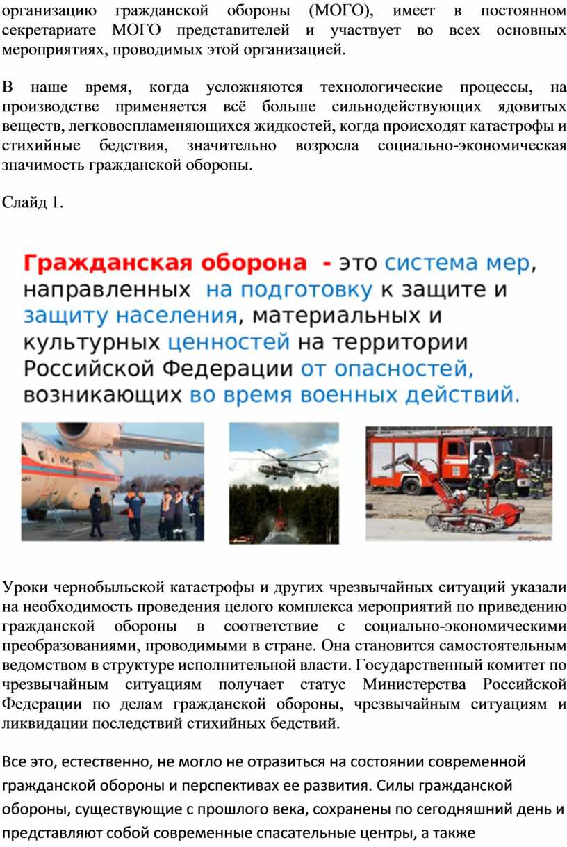 В наше время, когда усложняются технологические процессы, на производстве применяется всё больше сильнодействующих ядовитых веществ, легковоспламеняющихся жидкостей, когда происходят катастрофы и стихийные бедствия, значительно возросла социально-экономическая значимость гражданской обороны.