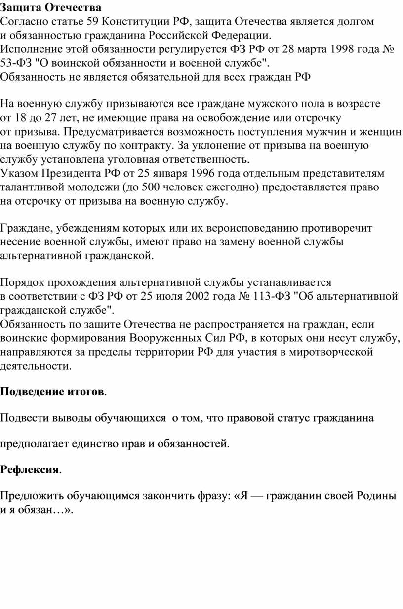 статье 59 Конституции РФ, защита Отечества является долгом и обязанностью