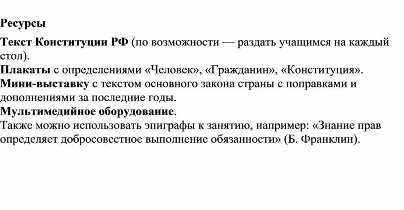 Также можно использовать эпиграфы к занятию, например: «Знание прав определяет добросовестное выполнение обязанности» (Б. Франклин).