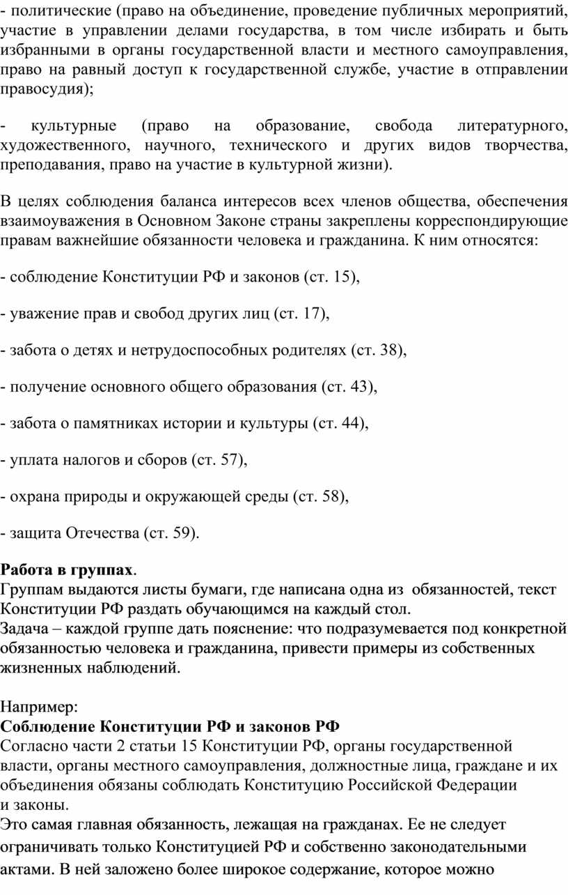 Группам выдаются листы бумаги, где написана одна из обязанностей, текст Конституции РФ раздать обучающимся на каждый стол.