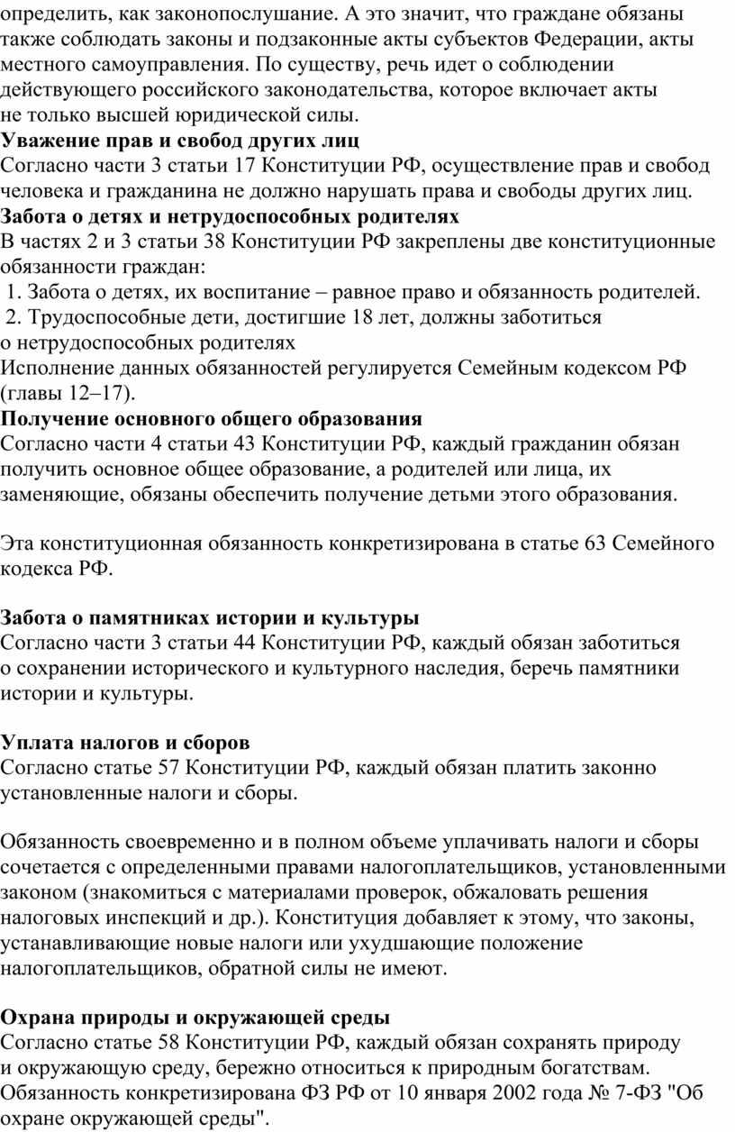 Это самая главная обязанность, лежащая на гражданах. Ее не следует ограничивать только Конституцией РФ и собственно законодательными актами. В ней заложено более широкое содержание, которое можно определить, как законопослушание. А это значит, что граждане обязаны также соблюдать законы и подзаконные акты субъектов Федерации, акты местного самоуправления. По существу, речь идет о соблюдении действующего российского законодательства, которое включает акты не только высшей юридической силы.