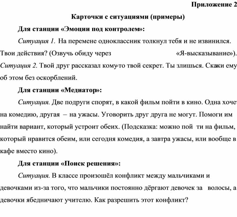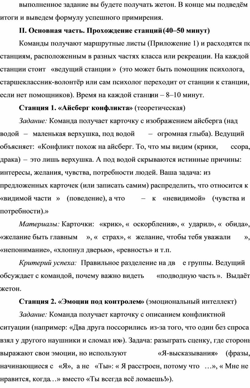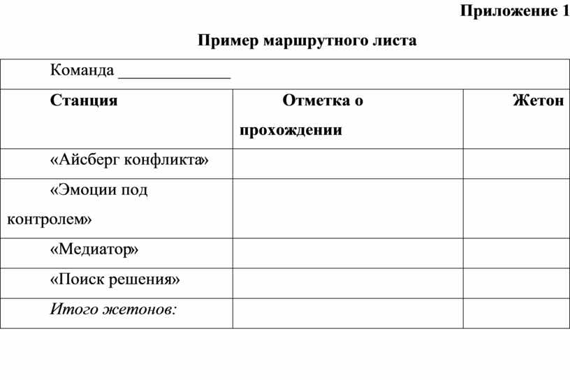Команды получают маршрутные листы (Приложение 1) и расходятся по станциям, расположенным в разных частях класса или рекреации. На каждой станции стоит «ведущий станции» (это может быть помощник психолога, старшеклассник-волонтёр или сам психолог переходит от станции к станции, если нет помощников). Время на каждой станции – 8–10 минут.