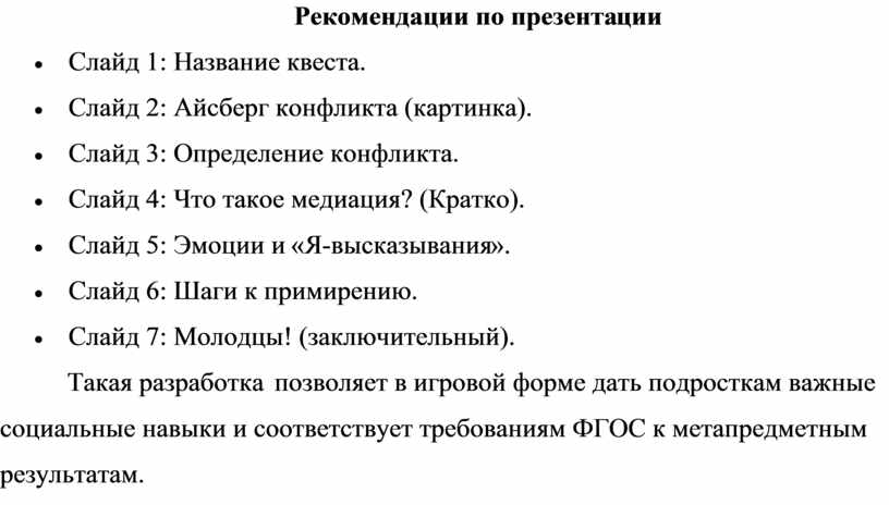Актуальность. Подростковый возраст характеризуется обострённым восприятием справедливости, повышенной эмоциональностью и частыми межличностными конфликтами. Неумение конструктивно разрешать споры ведёт к дракам, буллингу, ухудшению психологического климата в классе. Обучение навыкам медиации (способности быть третьей стороной, помогающей договориться) не только снижает уровень конфликтности, но и развивает важнейшие социальные компетенции: эмпатию, умение слушать, аргументировать свою позицию, искать компромиссы.