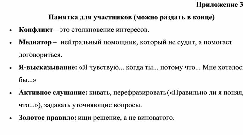 краткую памятку медиатору: «Выслушай каждого, не перебивая», «Перефразируй,