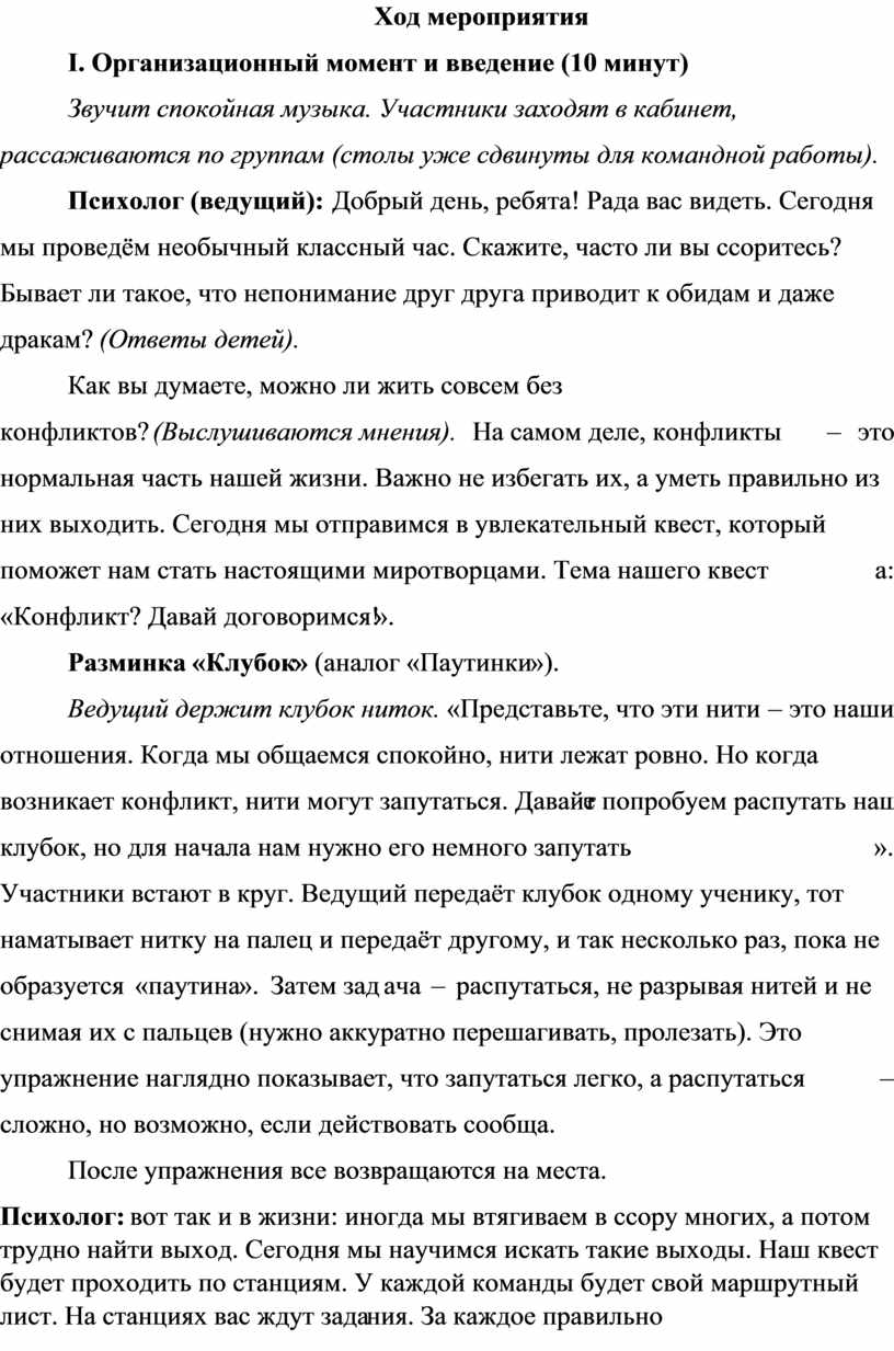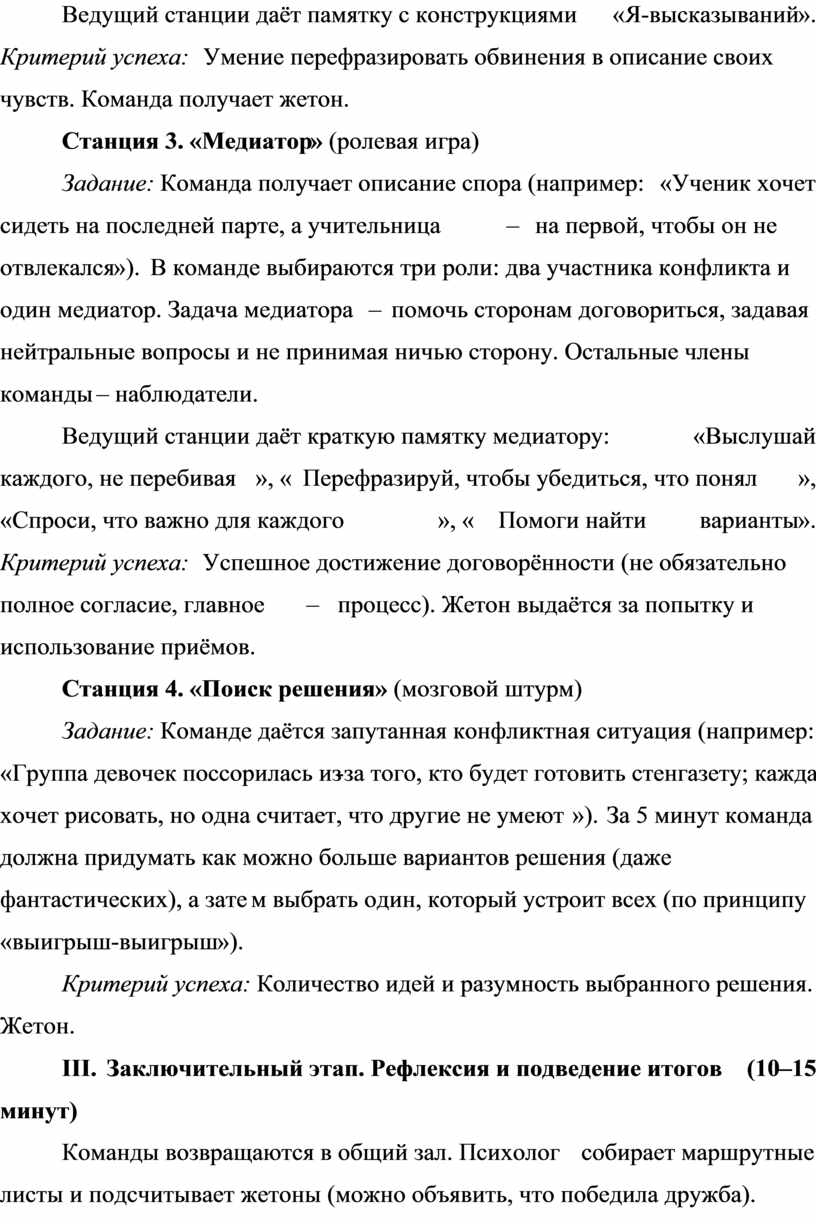 Психолог: вот так и в жизни: иногда мы втягиваем в ссору многих, а потом трудно найти выход. Сегодня мы научимся искать такие выходы. Наш квест будет проходить по станциям. У каждой команды будет свой маршрутный лист. На станциях вас ждут задания. За каждое правильно выполненное задание вы будете получать жетон. В конце мы подведём итоги и выведем формулу успешного примирения.