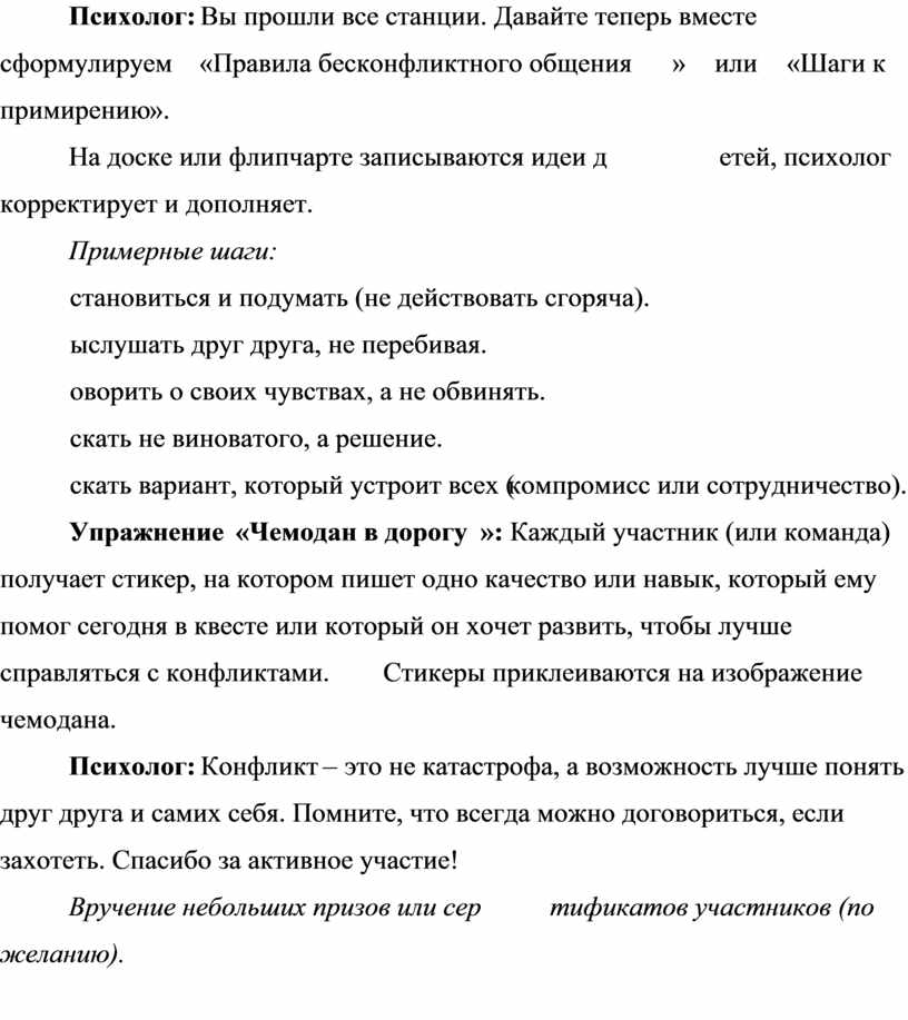Психолог: Вы прошли все станции. Давайте теперь вместе сформулируем «Правила бесконфликтного общения» или «Шаги к примирению».