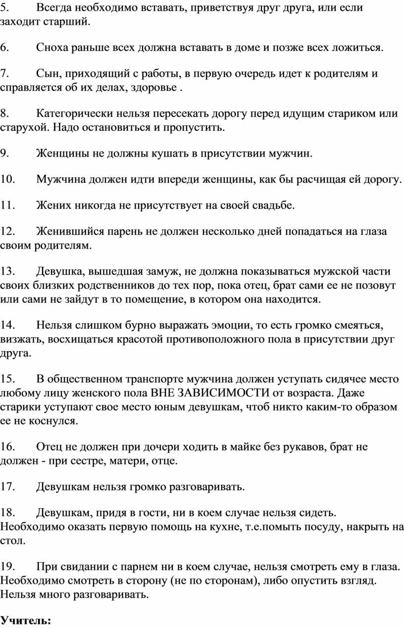 1. Девушка не должна встречаться с парнем наедине. Свидание парня с девушкой может происходить только в присутствии родственников.