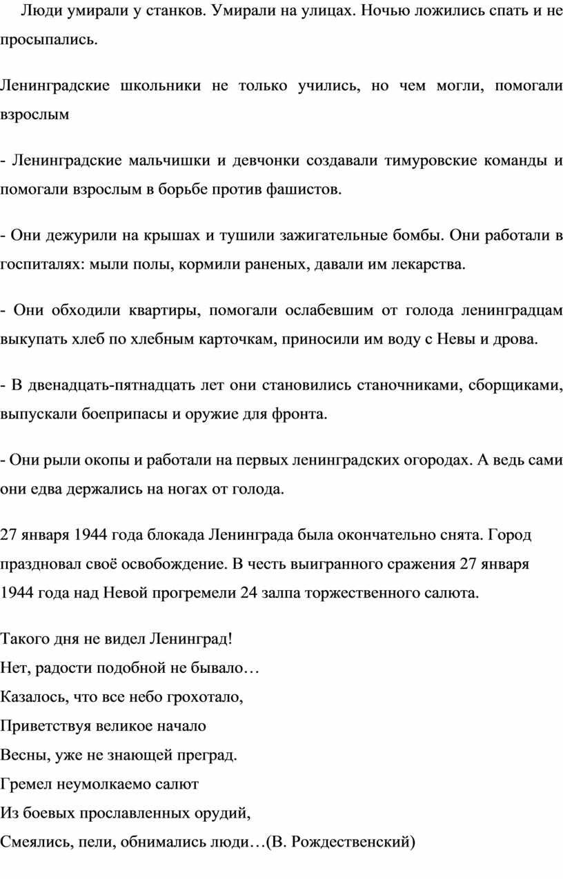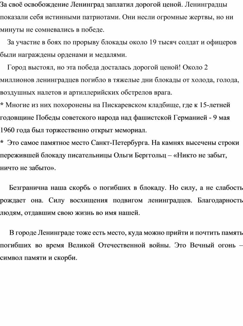 За своё освобождение Ленинград заплатил дорогой ценой. Ленинградцы показали себя истинными патриотами. Они несли огромные жертвы, но ни минуты не сомневались в победе.