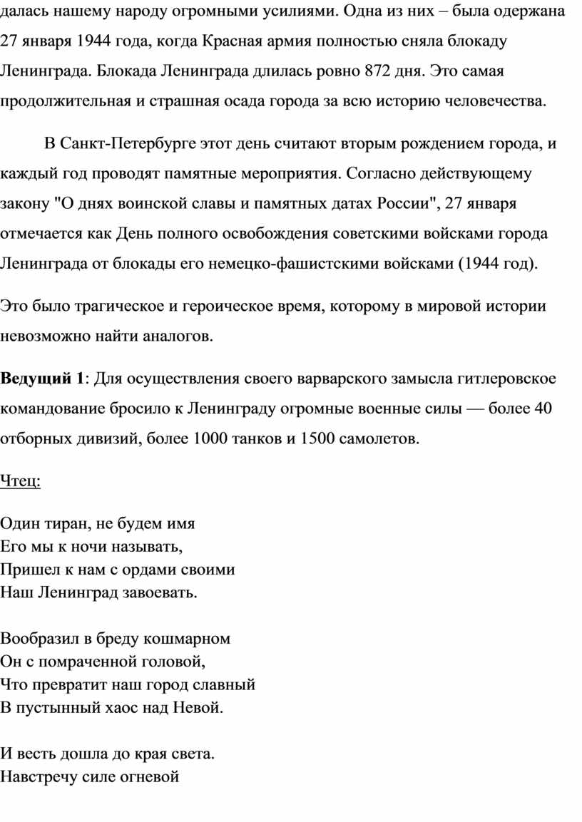 В этом году наша страна отметила важную дату - ровно 80 лет назад советская армия одержала победу над фашисткой Германией. Эта победа далась нашему народу огромными усилиями. Одна из них – была одержана 27 января 1944 года, когда Красная армия полностью сняла блокаду Ленинграда. Блокада Ленинграда длилась ровно 872 дня. Это самая продолжительная и страшная осада города за всю историю человечества.