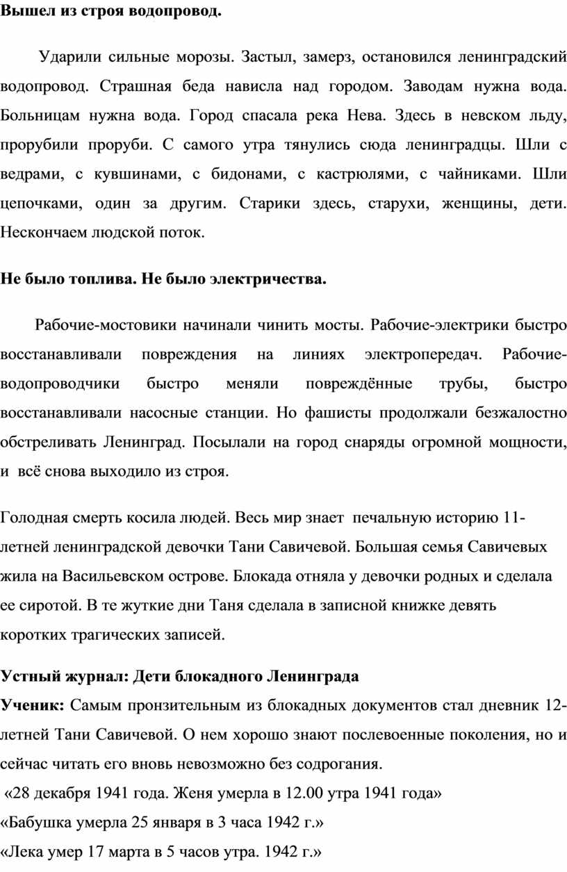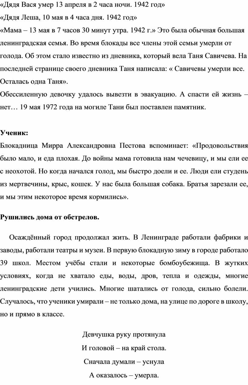 «Мама – 13 мая в 7 часов 30 минут утра. 1942 г.» Это была обычная большая ленинградская семья. Во время блокады все члены этой семьи умерли от голода. Об этом стало известно из дневника, который вела Таня Савичева. На последней странице своего дневника Таня написала: « Савичевы умерли все. Осталась одна Таня».