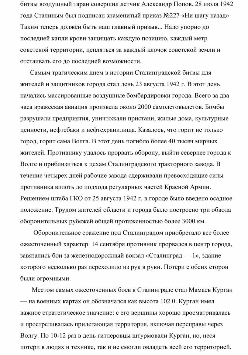 битвы воздушный таран совершил летчик Александр Попов. 28 июля 1942 года Сталиным был подписан знаменитый приказ №227 «Ни шагу назад» Таким теперь должен быть наш главный призыв... Надо упорно до последней капли крови защищать каждую позицию, каждый метр советской территории, цепляться за каждый клочок советской земли и отстаивать его до последней возможности.