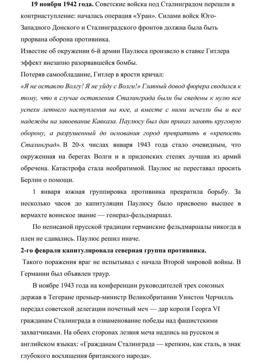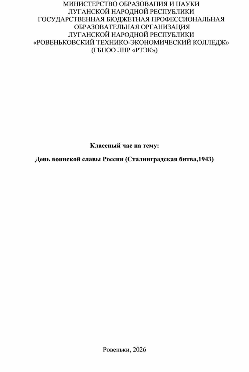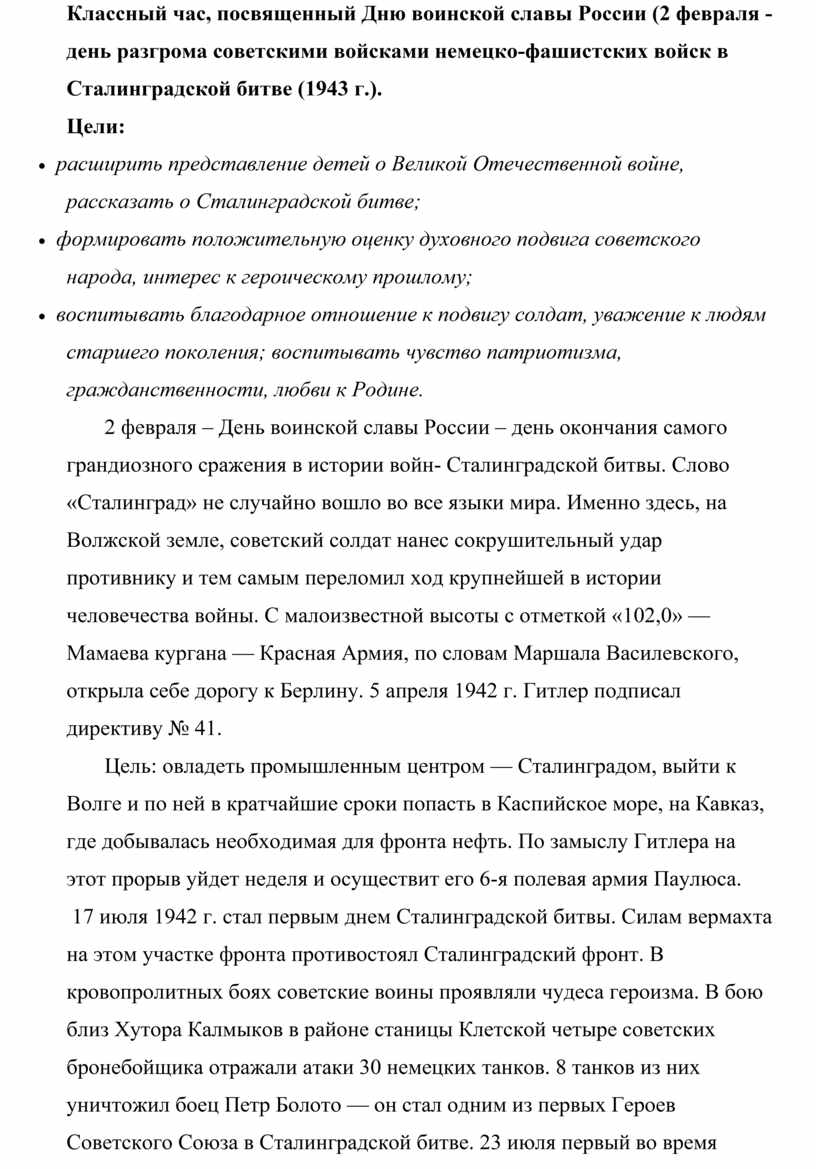 Классный час, посвященный Дню воинской славы России (2 февраля - день разгрома советскими войсками немецко-фашистских войск в Сталинградской битве (1943 г.).